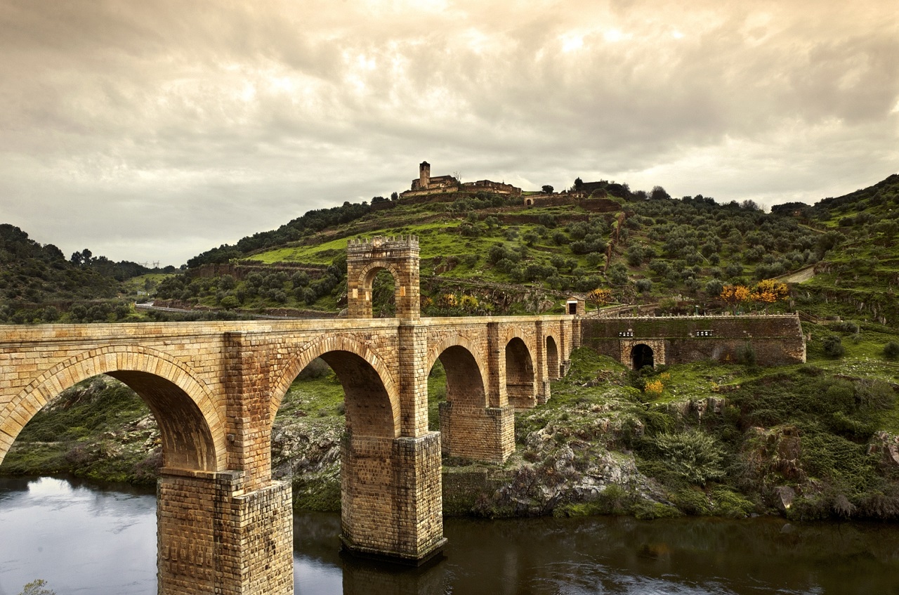 En Alcántara encontramos un impresionante puente romano, sin lugar a dudas, uno de los iconos de Extremadura. Concluido hacia el año 106, es único en el mundo por sus dimensiones y morfología: seis arcos, 194 metros de longitud, ocho de ancho y 71 de altura máxima. Posee las tres cualidades que se le pedían a toda edificación de aquella época: firmeza, hermosura y utilidad. “Este puente durará mientras dure el mundo”, se lee en una inscripción.